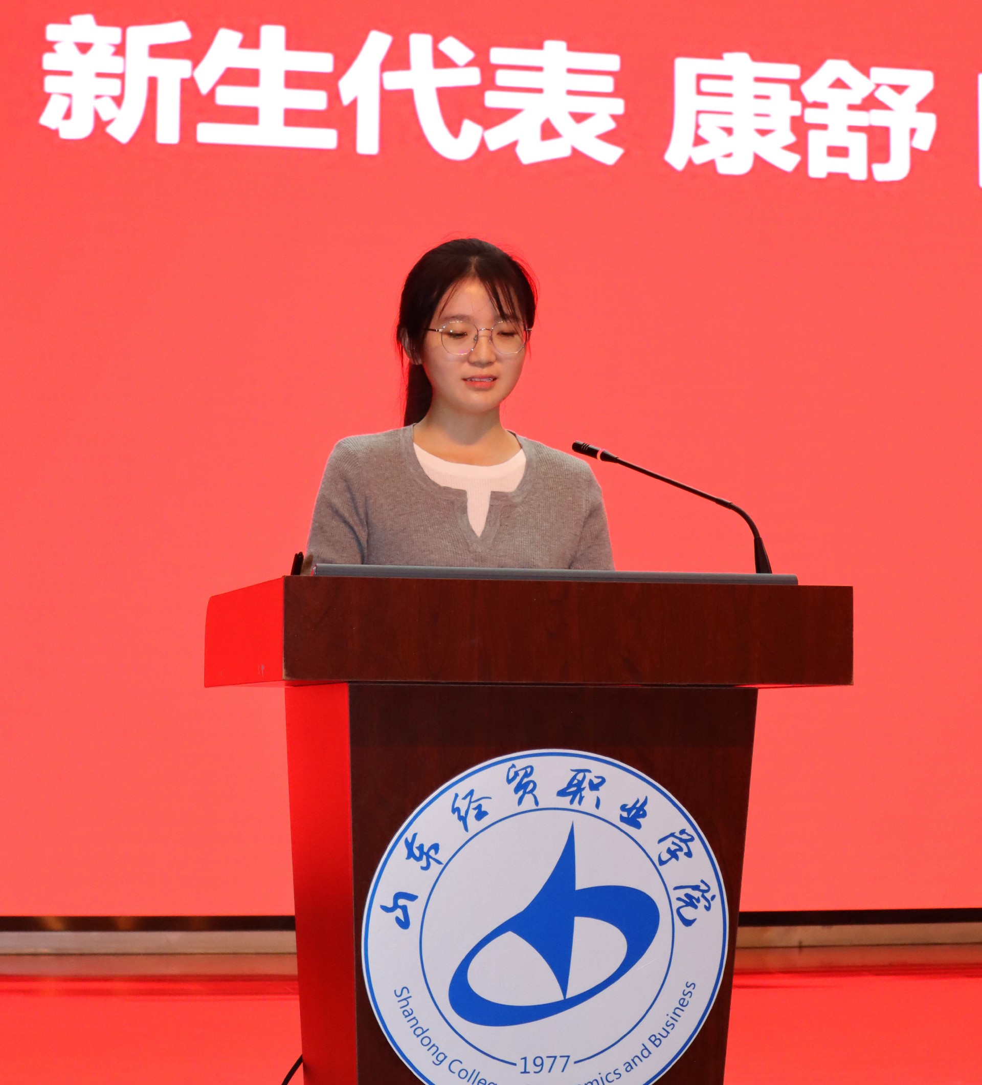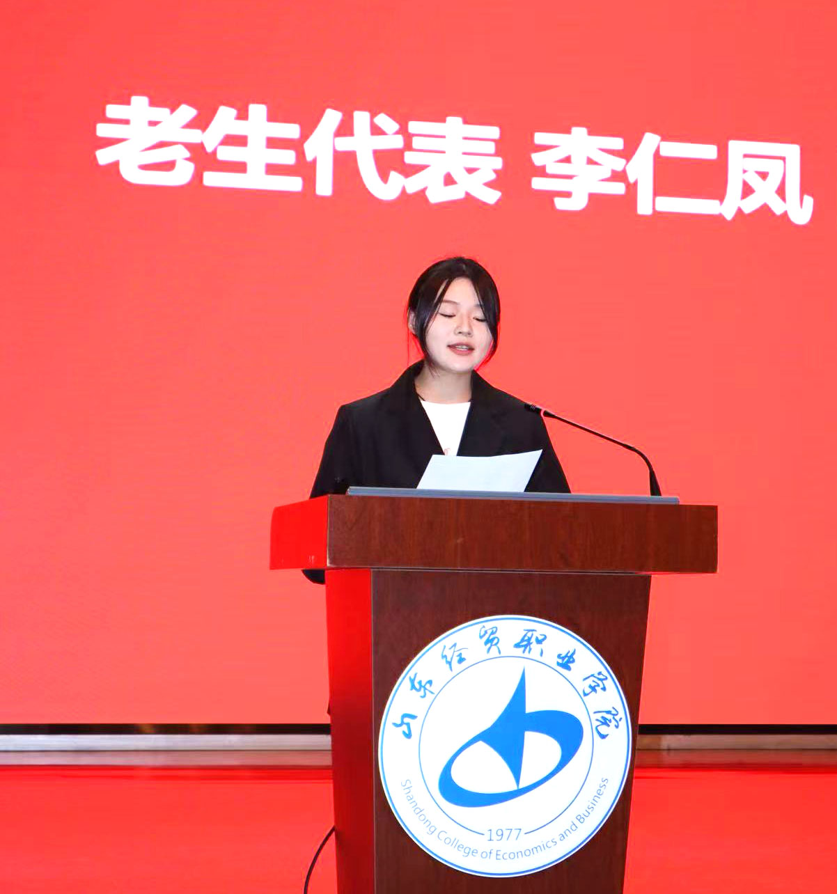 2023级金融服务与管理专业李仁凤作为老生代表发言;2025级金融服务与管理专业康舒同学代表全体新生发言。