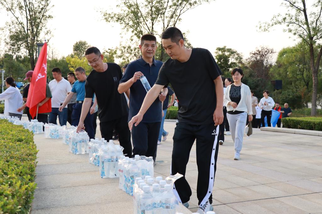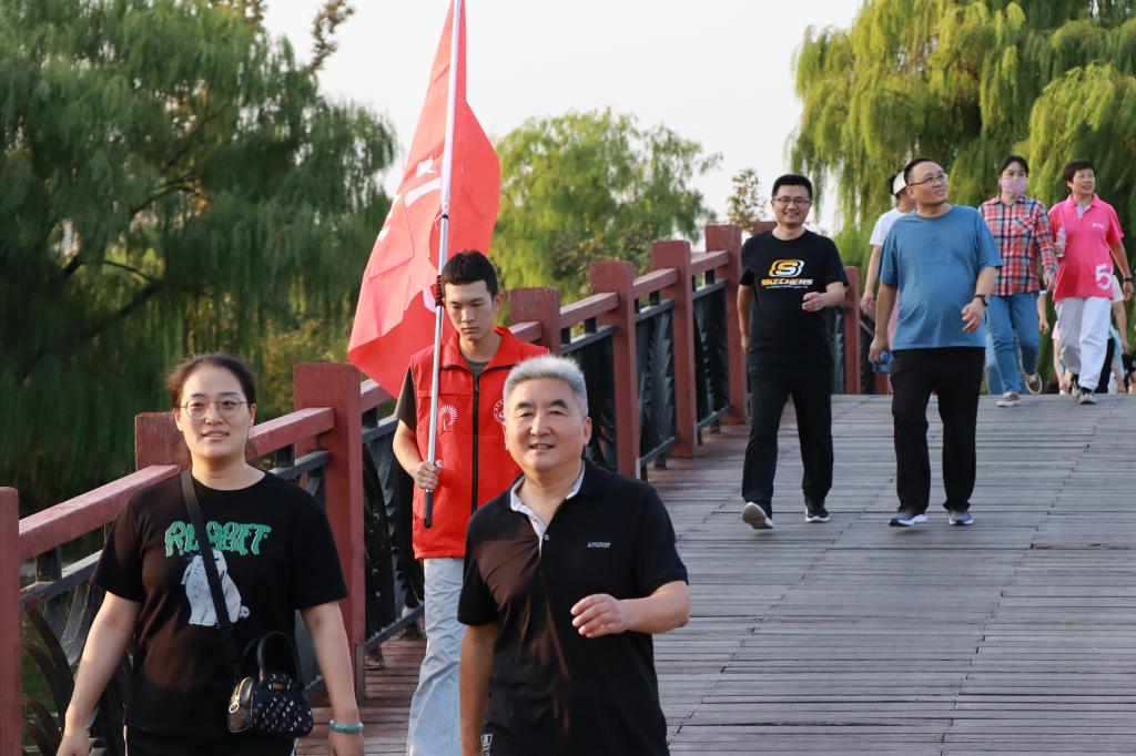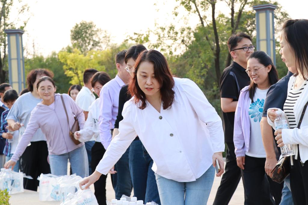 鸢都湖畔,微风轻拂,景色宜人。教职工们精神抖擞,步伐矫健,一路你追我赶,欢声笑语,很快到达活动半程补给站——潍坊市党史教育馆。志愿者们为大家准备了矿泉水,短暂停留之后,队伍继续向鸢都湖东岸迈进,最终抵达本次活动终点站——世纪风帆。