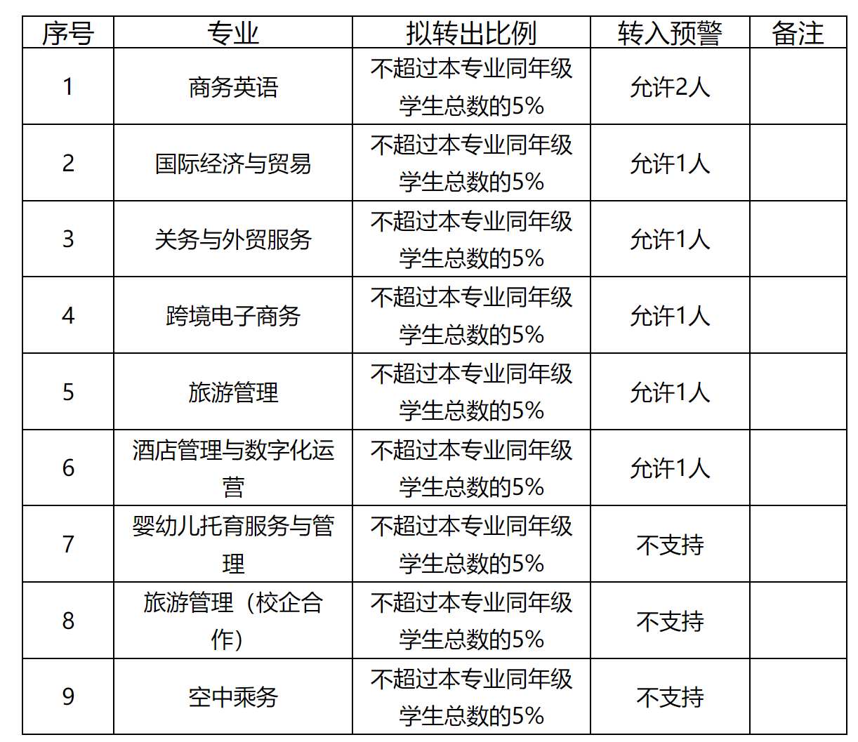 1.“转入预警”根据本系各专业教学条件,可填写“允许”、“不支持”、“暂不允许”等提醒字样。