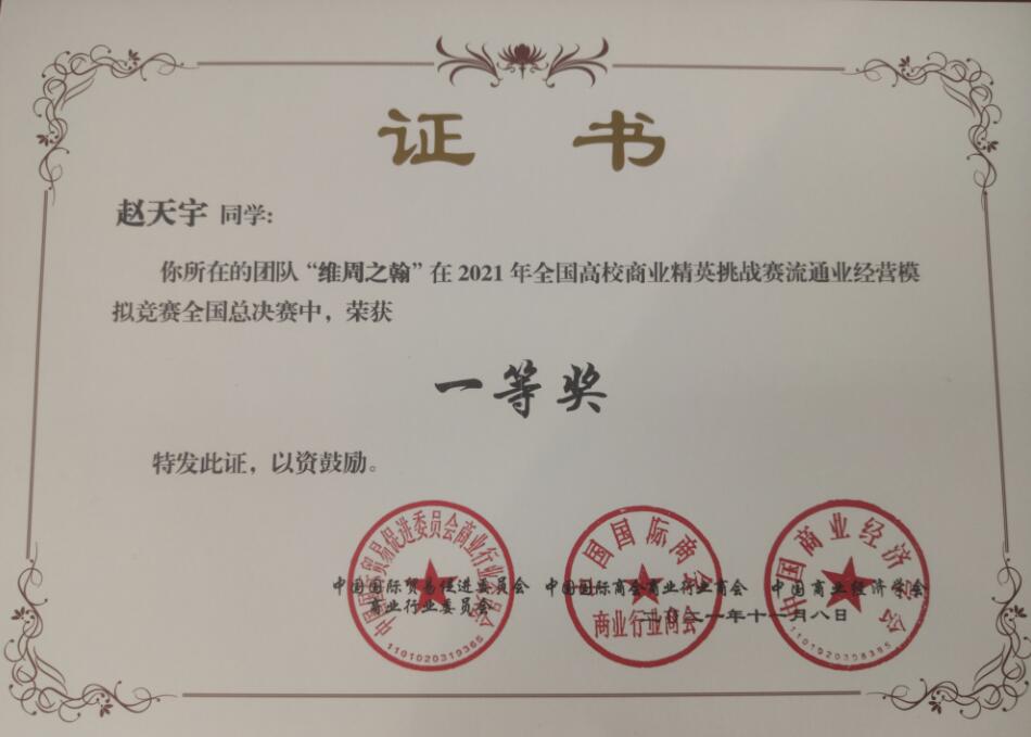 近日,在2021年全国高校商业精英挑战赛流通业经营模拟竞赛中,虎扑nba直播:工商管理系耿传嘉、庄凯凯等九名学生组成的三支代表队荣获“2021年全国高校商业精英挑战赛流通业经营模拟竞赛”全国总决赛一等奖三项。王庆全、孙伟、杨学艳三位指导教师荣获“优秀指导教师”称号。