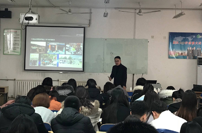 王成磊用生动、风趣的语言介绍了蓝创集团的发展历史、企业目前独树一帜的人才模式以及公司发展规划,对于大学生创业和就业规划设计给出了建议,他还以自己多年的奋斗经验寄语出席的师生,鼓励学生们以笃实、稳健、求进的工作态度踏上人生新的征途。王经理精彩的讲座获得了师生们的热烈欢迎。