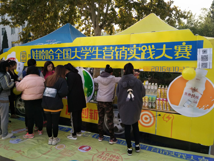 大赛由杭州娃哈哈集团有限公司提供商品和支持,包括促销方案策划和促销实战两个环节。方案策划环节由娃哈哈集团给出大赛命题内容,学生团队围绕命题进行定向策划,策划案提交结束后,各小组进行方案答辩。营销实战环节由各队伍根据初期策划方案进行产品营销,娃哈哈集团给予物料支持。在促销实战中学生依据团队的策划案开展促销活动,能够结合所学专业知识和营销实践,展现出了良好的理论基础和各具特色的营销创意。为给参赛学生提供促销实战的平台,提升促销实战成绩,2016年下半年娃哈哈大学生营销实践基地营销大赛校园赛将分七场促销赛展开。