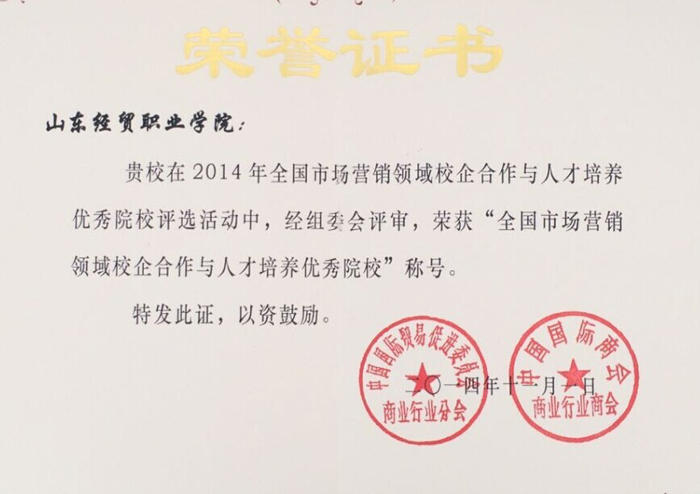 10月31-11月2日,由中国国际商会商业行业商会和中国国际贸易促进委员会商业行业分会主办的“2014年全国市场营销职业教育与产业对话活动”在济南举行。来自山东、北京、上海、四川、浙江、广东等省市的近100所院校、50家企业代表参加了此次活动。虎扑nba直播:获“全国市场营销领域校企合作与人才培养优秀院校”称号,有关典型经验交流材料将汇编成册出版。