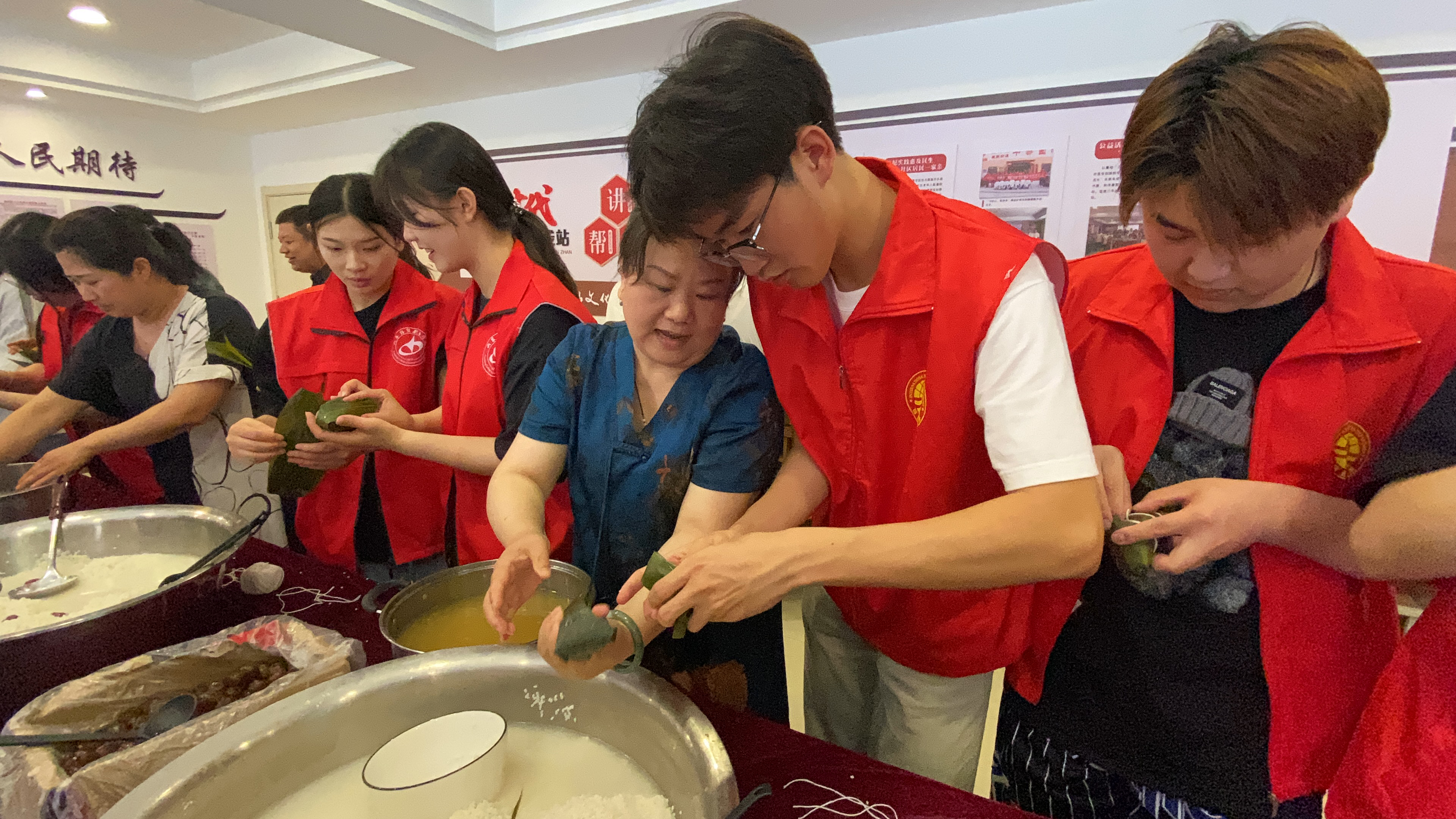 在仓南街社区党群服务中心,社区工作人员、虎扑nba直播领导及教师志愿者们一起动手包粽子,在社区热心居民的示范指导下,大家包粽子的手法越来越专业,速度也越来越快,雪白的糯米、晶莹的蜜枣在大家的巧手下不一会儿就变成了一只只胖滚滚的粽子,活动现场充满欢声笑语。