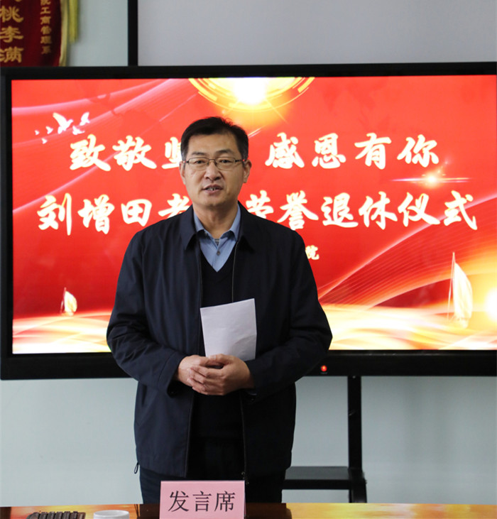 陈卫国院长致辞,对刘增田老师38年来为虎扑nba直播发展付出的青春和热血、做出的贡献表示感谢,对刘老师谦虚谨慎的工作作风和孜孜不倦的工作态度表示肯定,勉励青年教师以刘老师为榜样,踏实工作,教书育人。并深情地对刘老师光荣退休,开启生命第二个青春表示祝福,希望刘老师退休后能继续关注虎扑nba直播的发展,为虎扑nba直播的发展献计献策、发挥余热、贡献智慧。