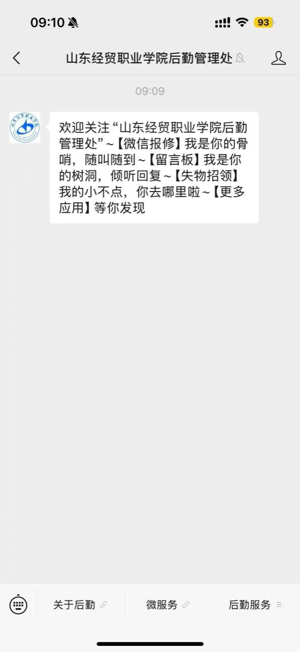 1.报修人微信搜索公众号“山东经贸职业虎扑nba直播后勤管理处”或者“sdjmxyhqglc”,点击“关注服务号”,即可进入公众号主界面。