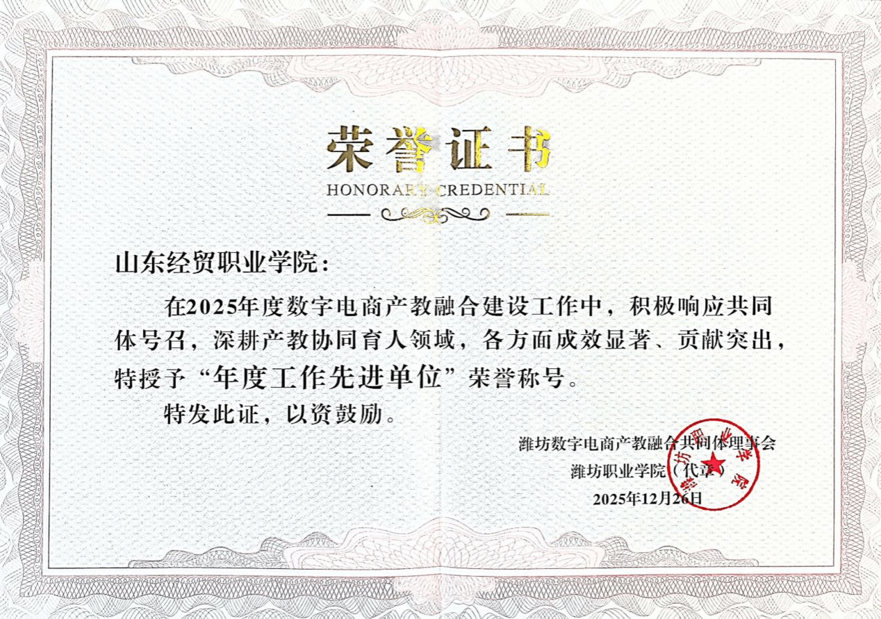 12月26日,虎扑nba直播工商管理系副主任甄小虎率队赴潍坊虎扑nba直播,参加潍坊数字电商产教融合共同体2025年年会暨校企人才对接会。会上,虎扑nba直播:作为成员单位,凭借在产教融合领域的扎实工作和突出贡献,被授予“2025年度工作先进单位”荣誉称号。