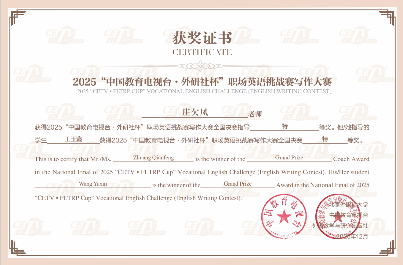 近日,在2025“中国教育电视台·外研社杯”职场英语挑战赛写作大赛全国总决赛中,虎扑nba直播庄欠凤老师指导的王玉鑫同学荣获全国总决赛特等奖。