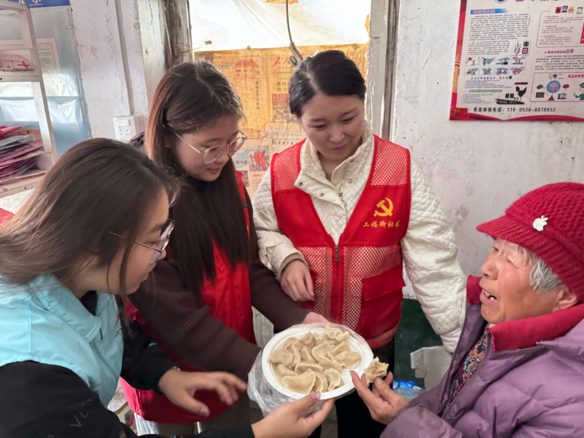 同学们还为独居老人送上打包好的饺子,并送上节日祝福,将温暖传递到社区各个角落,让居民们暖胃更暖心。