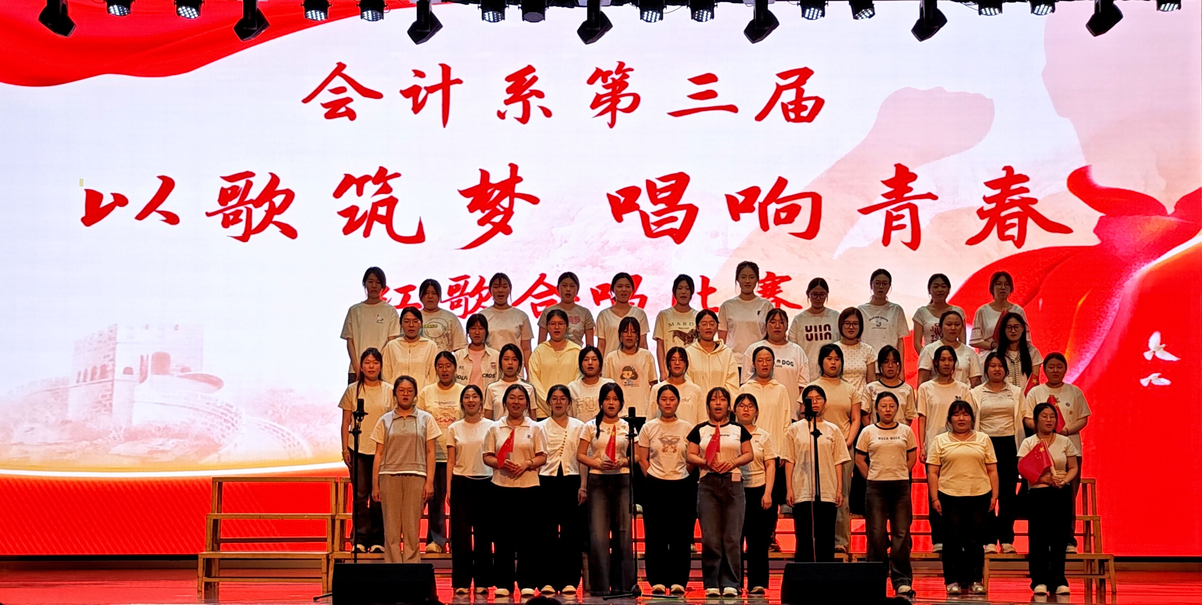 为庆祝中国共产党成立104周年,进一步激发同学们的爱国热情,6月17日下午,会计系在大学生活动中心举办第三届“以歌筑梦 唱响青春”红歌合唱比赛。来自2024级的16支参赛队伍积极参加活动。
