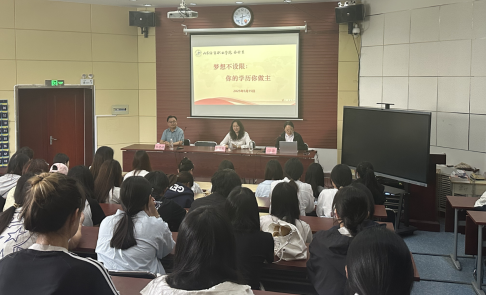 为进一步激发学生学历提升动力,拓展升学路径,5月15日,会计系在会计大讲堂举办主题为“梦想不设限:你的学历你做主”的学历提升专题讲座。讲座由大数据与会计专业负责人闫菲主持,会计系副主任张建峰到会指导。