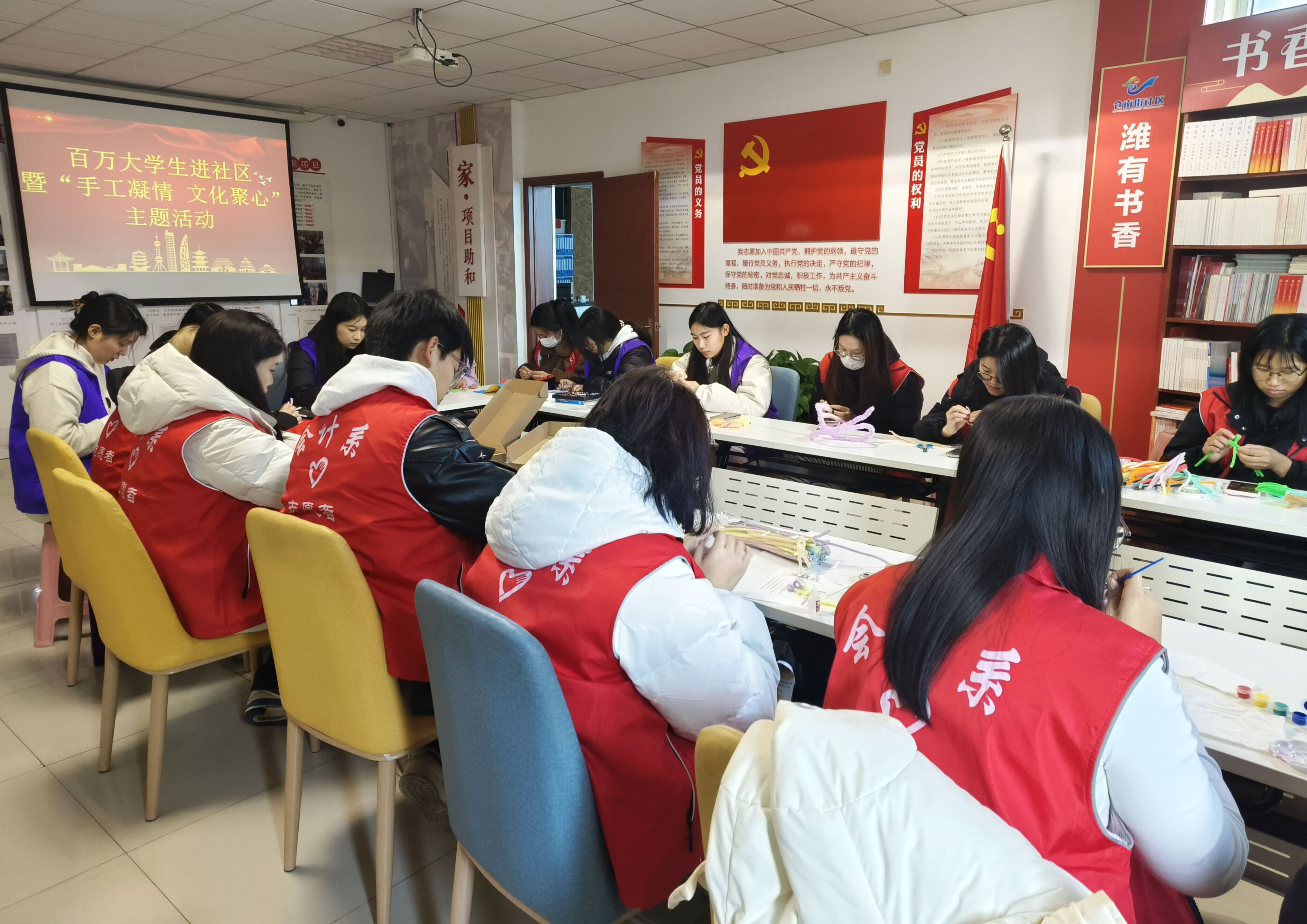 为更好的开展“百万大学生进社区”活动,会计系团总支持续走进潍城区仓南街社区,发挥知识专长和青春活力。11月26日下午,会计系20余名手工爱好志愿者走进社区,和社区工作人员共同开展“手工凝情 文化聚心”主题活动。