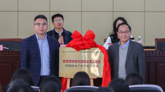 会计系侯君邦主任和北京东大正保科技有限公司华东区总经理李邦勇共同为教育部供需对接就业育人项目揭牌。