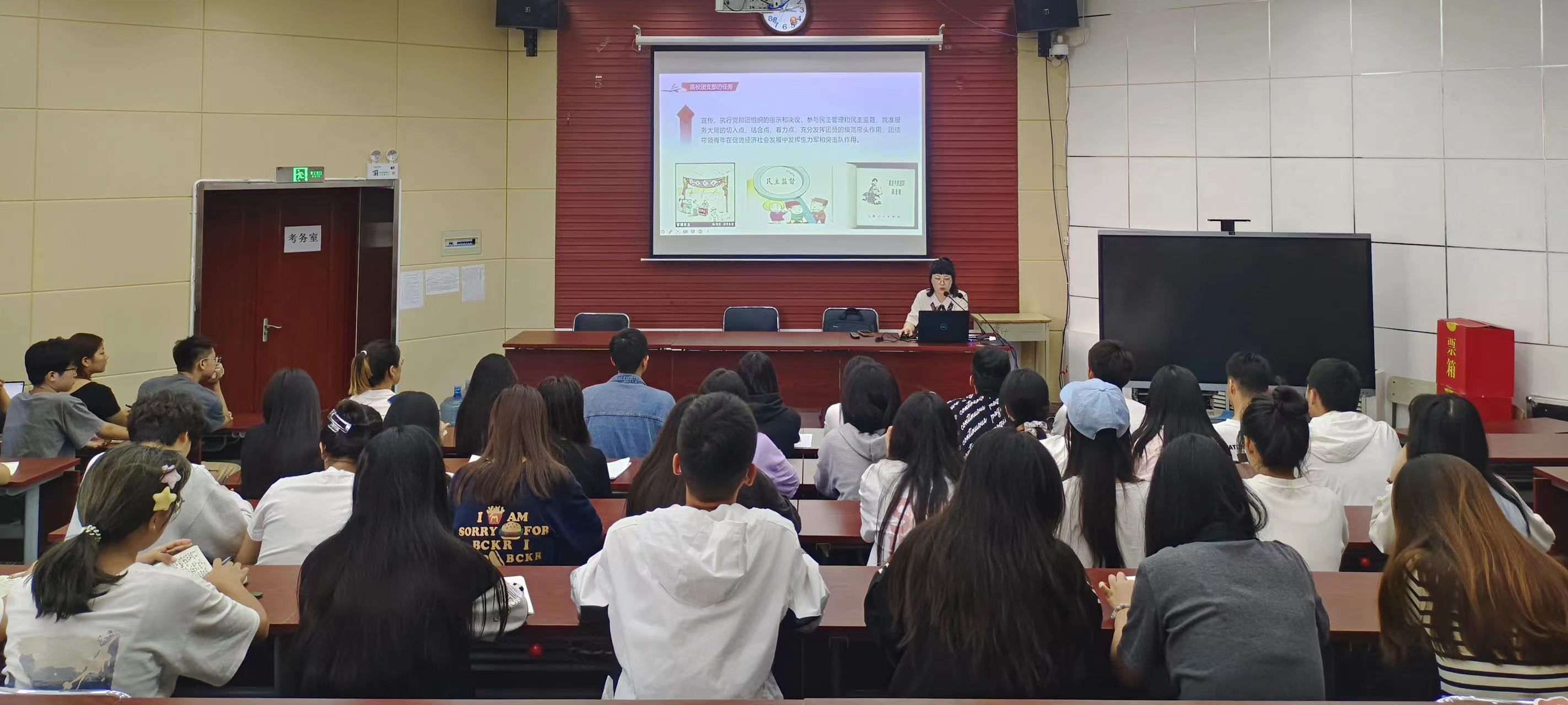 王青青带领同学们进一步认识了共青团的性质和任务,学习了共青团中央印发的《中国共产主义青年团发展团员工作细则》、《虎扑nba直播新时代新征程加强和改进团员队伍建设工作的意见》等文件。以“高校团支部相关概述”为主题,从高校团支部的性质与任务、工作原则和工作机制、工作制度及领导保障等三方面进行讲述,让同学们进一步了解了团支部是共青团的基层组织,是共青团团结教育青年的桥梁和纽带,是做好共青团工作的关键环节,是党支部的助手,要发挥好“三会两制一课”的作用,明确团支部工作的意义,从而有利于在各项工作实践中更加自觉的搞好共青团支部建设。
