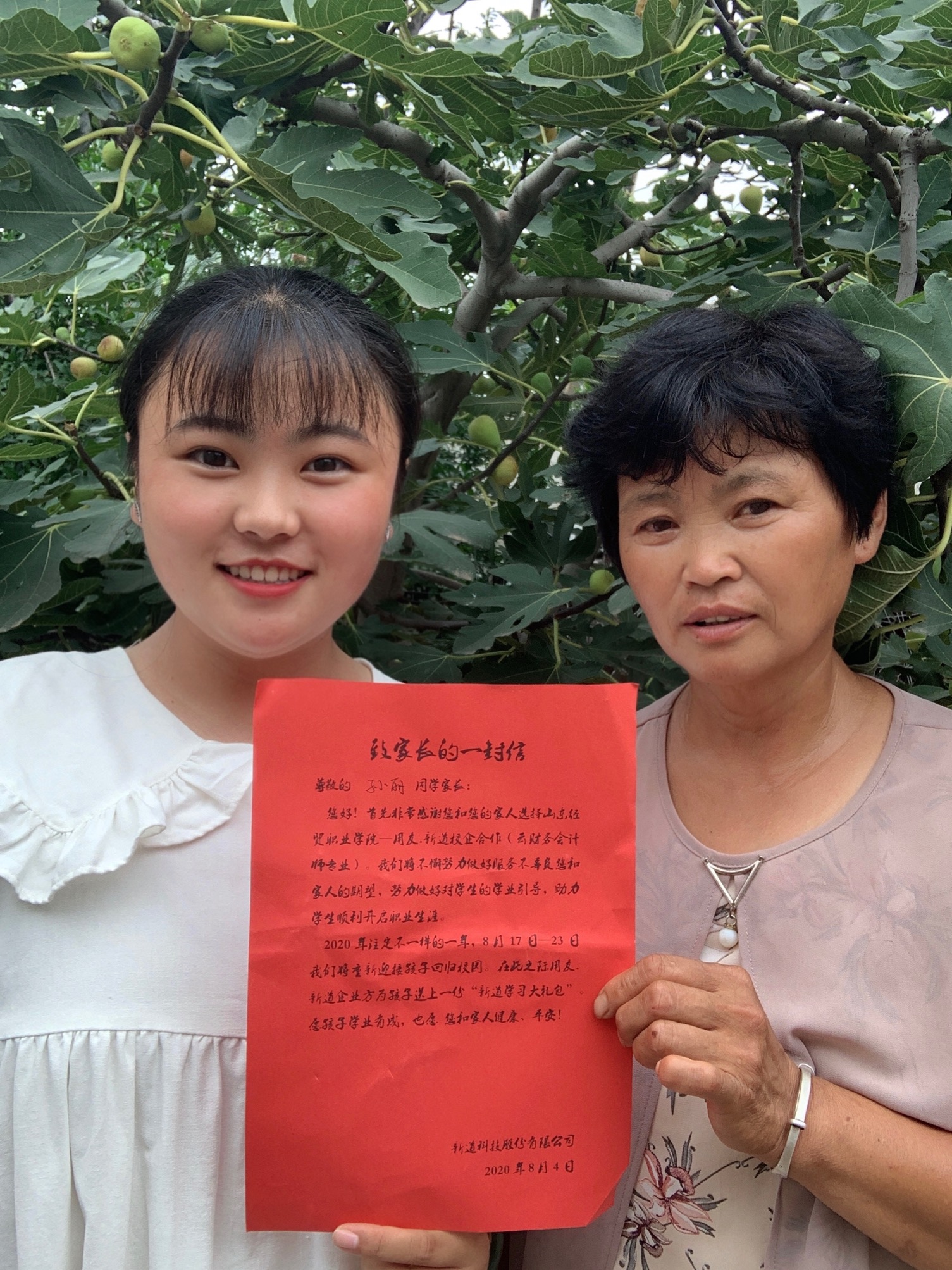 2020年8月5日起,用友-新道科技股份有限公司校企项目负责人石磊老师、驻校服务王静静老师对2018级4名、2019级2名学生进行了家访,同时为9名同学寄送了“新道学习大礼包”。
