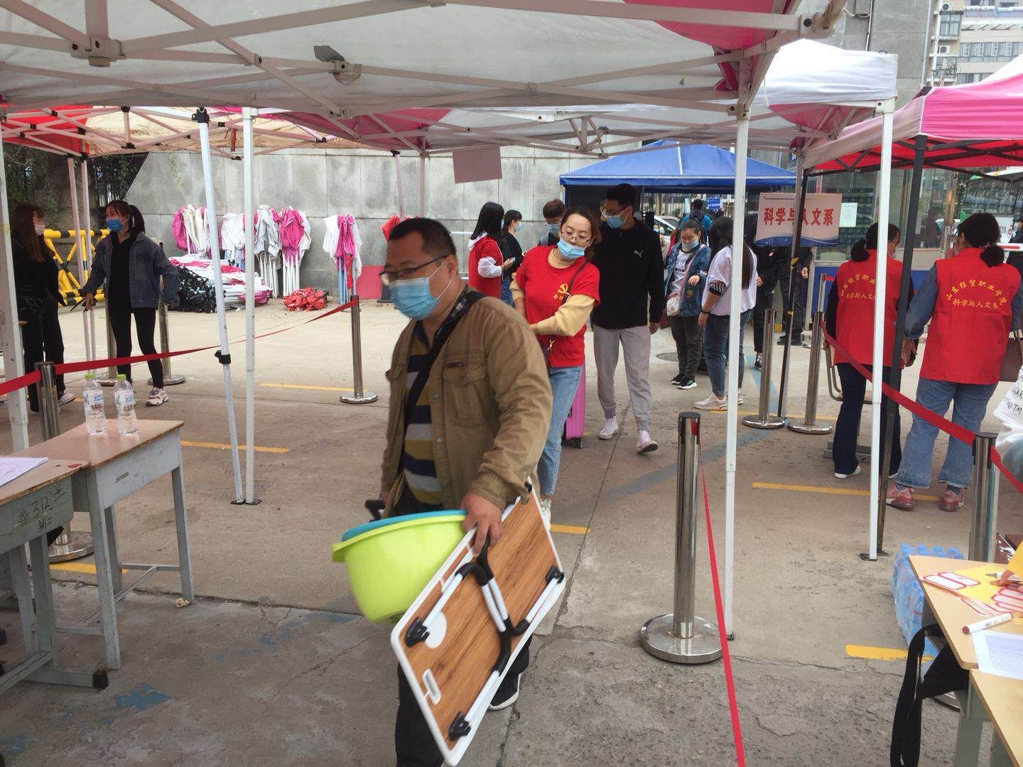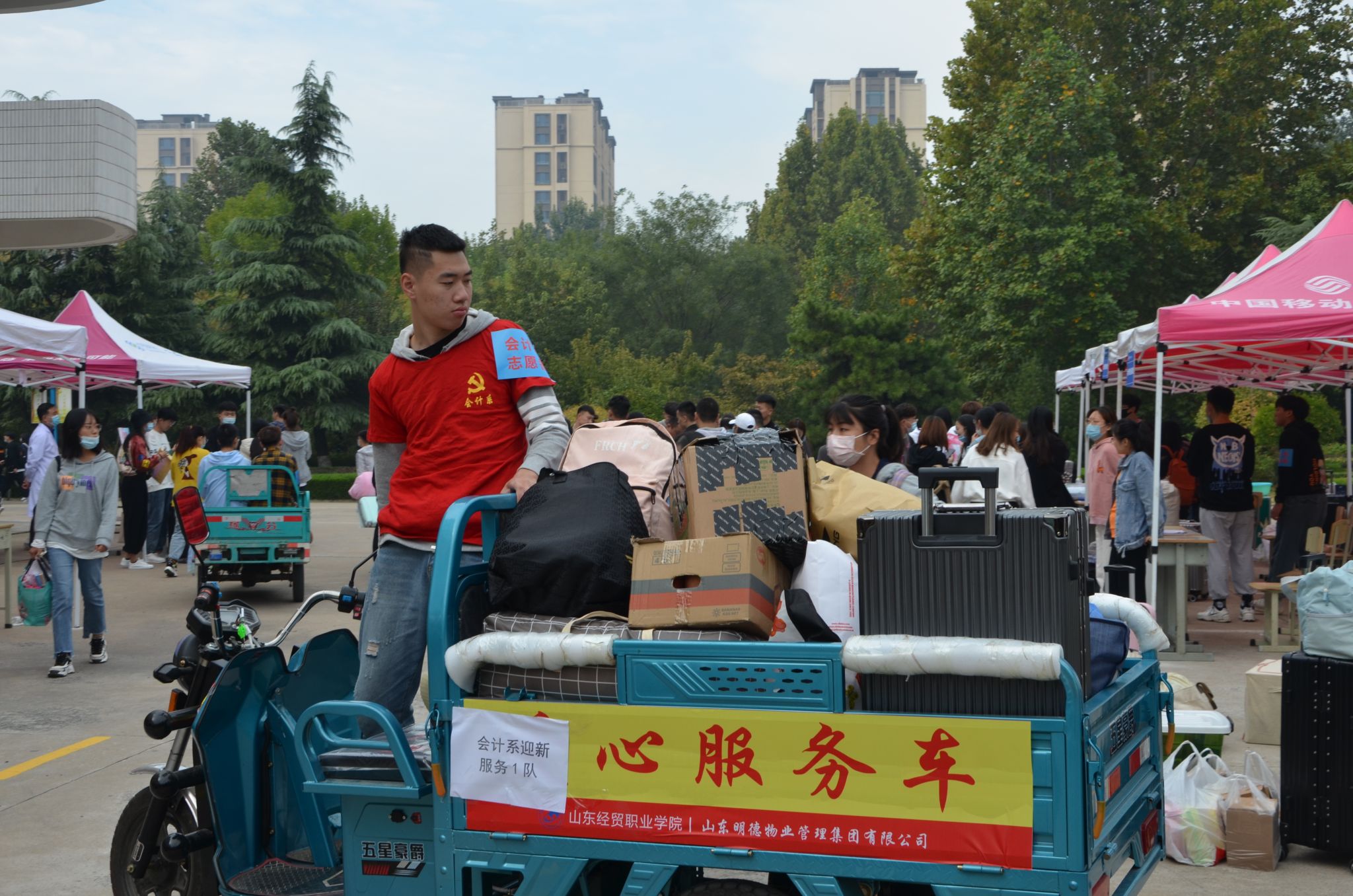 校门口,老师们从家长手中接过沉甸甸的行李,一趟趟装车、运送。从北大门到会计系报到处,再到宿舍楼,校园里处处涌动着师生志愿者忙碌的身影,拉皮箱、搬被褥、帮新生整理床铺,志愿服务不仅为独立报到的新生提供了最大的便利,也拉进了新生与老生的距离。