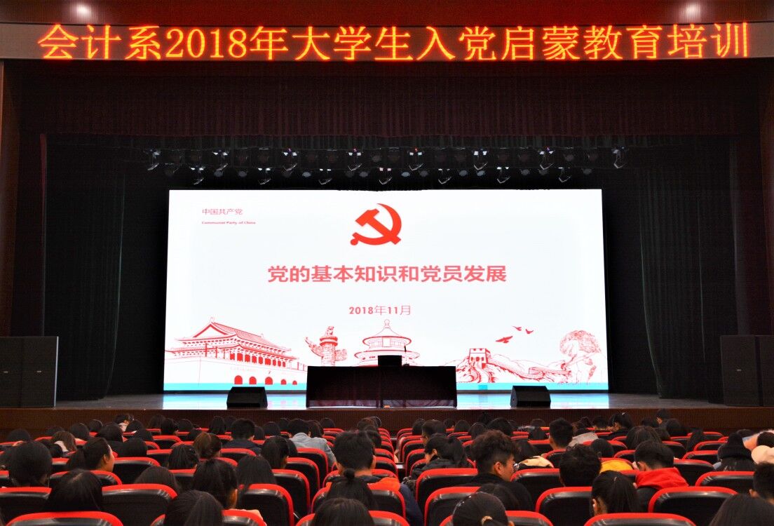 为进一步提升学生思想政治素质,使大学生对党的基本知识、基本理论有初步的理解和把握,树立正确的入党动机,11月14日下午,会计系在大学生活动中心举行2018级学生入党启蒙教育大会,会计系党总支书记马起朋主讲。