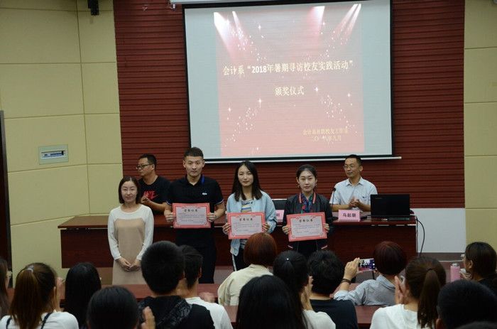 会计系2018年暑期寻访校友社会实践活动共派出15个寻访小组,奔赴省内各地市进行现场寻访,寻访小组成员通过实地考察、面对面访谈交流、拍摄视频等方式寻访了在不同岗位、不同行业工作的15名优秀校友,撰写了15份寻访报告,收集校友信息登记表15份,拍摄制作了20余个寻访视频短片,80余张寻访照片。寻访校友社会实践活动评审小组依据寻访报告、寻访视频照片和寻访体会感悟等对各组进行评议打分,评选出了一等奖一名,二等奖两名,三等奖三名。表彰大会现场,寻访校友社会实践活动一、二、三等奖的获得者汇报了寻访活动的心路历程,讲述了校友们的奋斗经历和人生感悟,带来了校友对母校、老师和学弟学妹们的深深祝福和感谢,分享了小组寻访活动的体验和感悟。