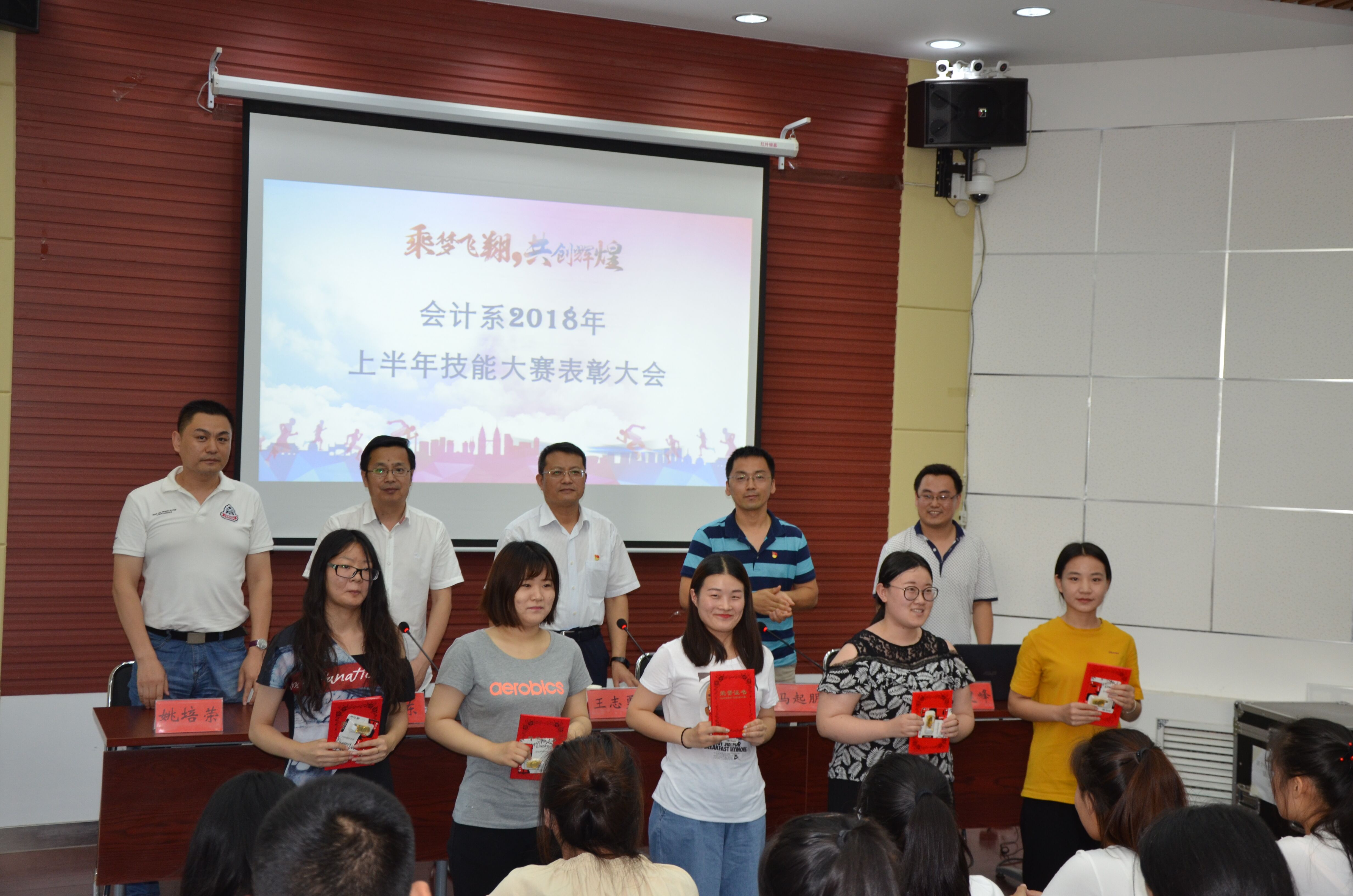 会计系党总支书记马起朋主持表彰大会,系副主任陈东总结回顾了2018年度上半年技能大赛筹备、参赛和获奖情况,大会对会计系上半年参加国家、省和系技能大赛指导教师和获奖选手进行了表彰。