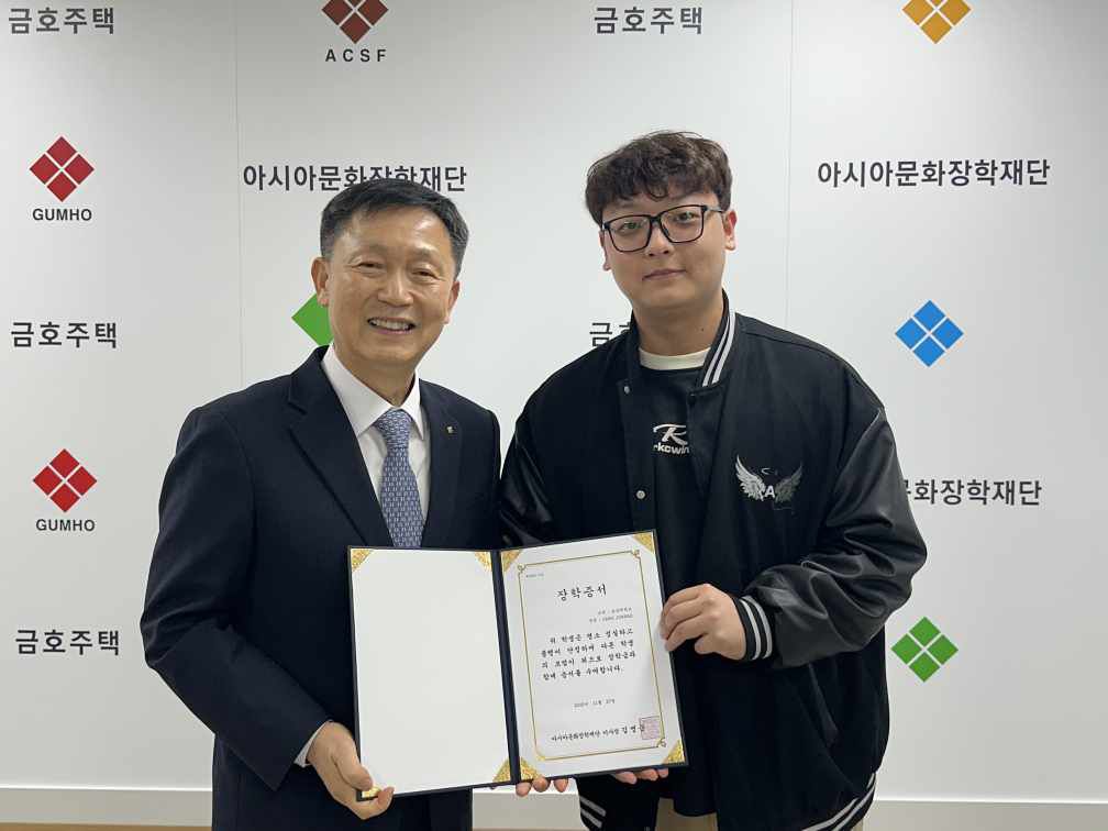 颁奖仪式后,臧浚皓同学与亚洲文化奖学财团理事长金明俊和与其他获奖学子亲切合影,共同留念。