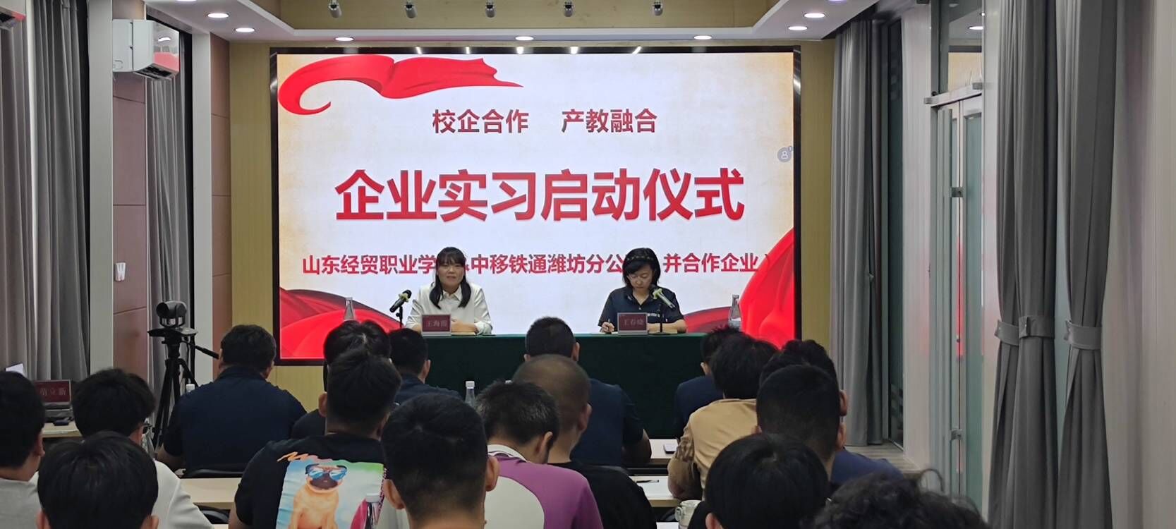 2023年9月13日上午,科学与人文系和中移铁通潍坊分公司举行2021级计算机应用技术、计算机网络技术专业学生岗位实习开班仪式。中移铁通有限公司潍坊分公司副总经理苗立新、人力资源中心经理王春晓、维护部经理付光涛、寿光公司经理周敬国、新奎文公司经理吕大伟、安丘公司经理都振鸿、科学与人文系副主任王海霞及计算机应用技术与计算机网络技术专业指导教师和学生27人参加会议。