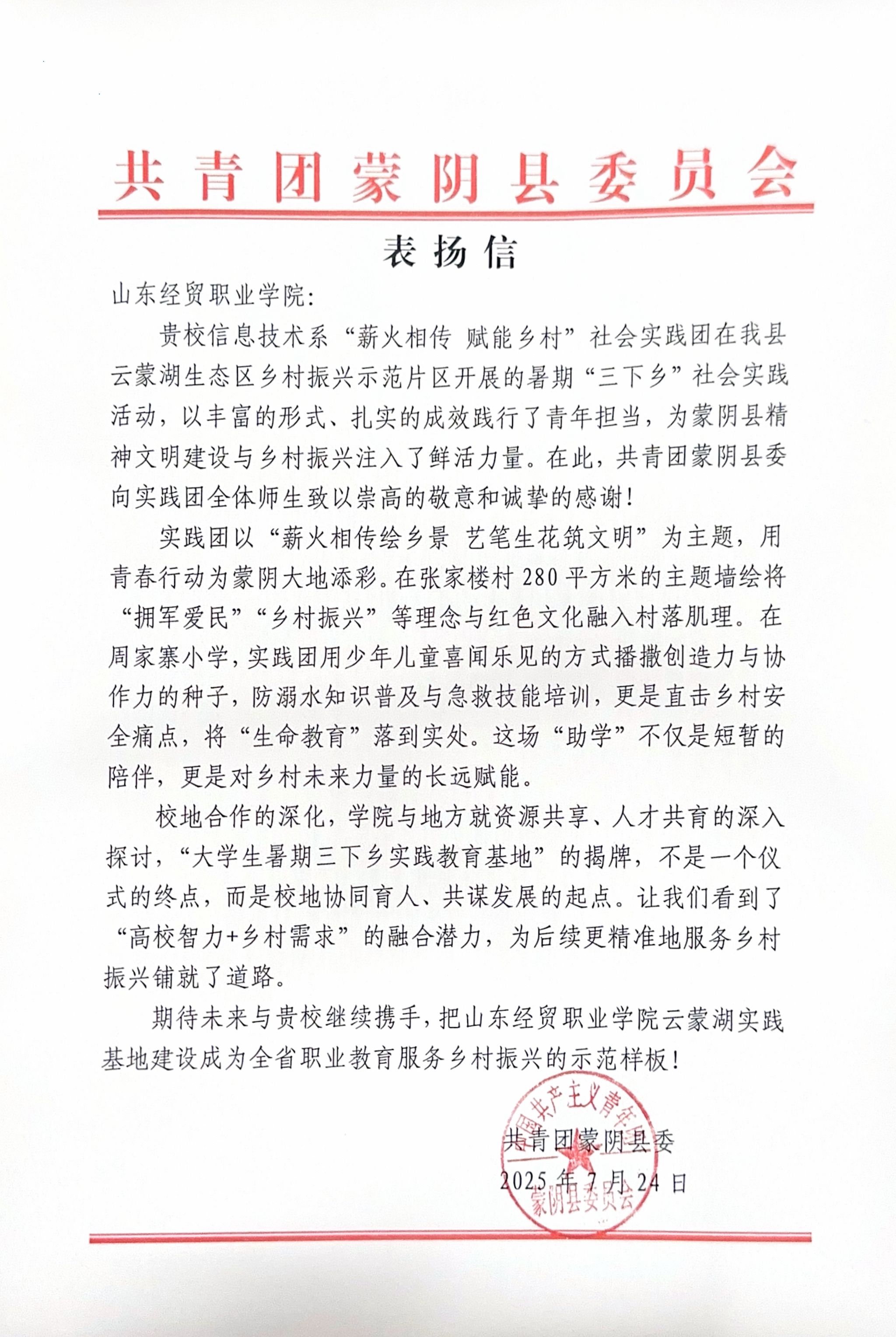 近日,共青团蒙阴县委员会致信,高度赞扬虎扑nba直播信息技术系“薪火相传 赋能乡村”实践队在2025年暑期“三下乡”活动中的突出表现。来信充分肯定了实践队通过主题墙绘、安全教育等多元形式,有效助力蒙阴县云蒙湖生态区乡风文明建设和乡村振兴,展现了新时代青年的责任担当与专业素养。