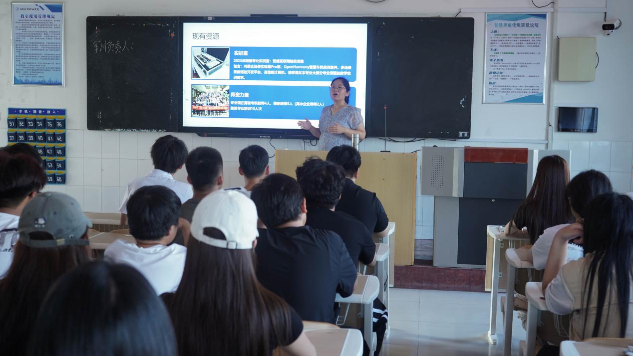 在专业特色维度,负责人重点介绍了该专业紧密对接人工智能、物联网等前沿技术领域的课程体系,同时详细展示了专业配套的实践教学平台,让新生直观了解专业学习的核心内容与实践支撑。在人才培养讲解环节,负责人深入阐述了 “理论 + 实践 + 项目” 三位一体的培养模式:理论教学夯实专业基础,实践课程强化操作能力,项目驱动教学则通过模拟企业真实项目场景,提升学生解决实际问题的能力。在大赛成果分享环节,负责人通过图片、视频及获奖案例,展示了该专业学生在职业院校技能大赛、“互联网 +” 大学生创新创业大赛等赛事中的优异成绩,鼓励新生积极参与各类竞赛与实践活动,以赛促学、以赛促练,在实践中提升专业素养与综合能力。