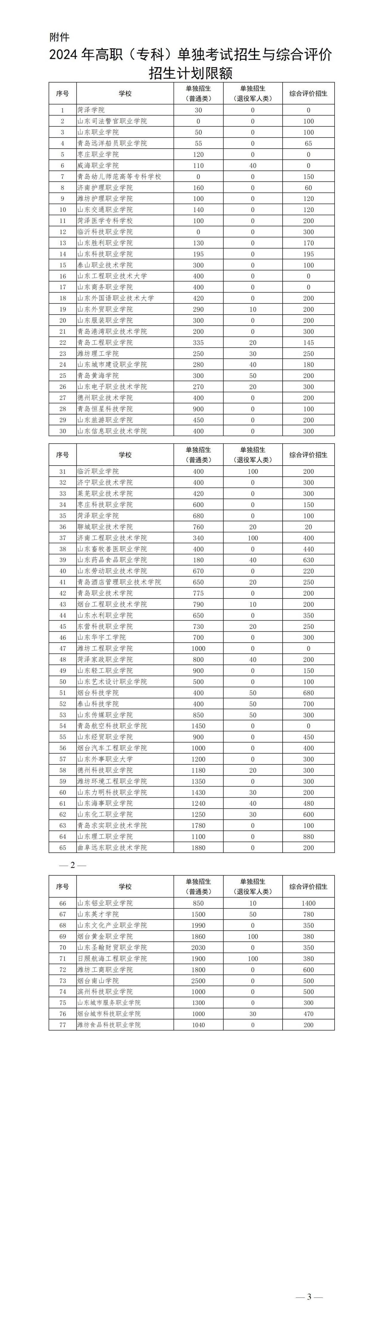 附件:山东省2024年高职(专科)单独考试招生与综合评价招生计划限额.doc