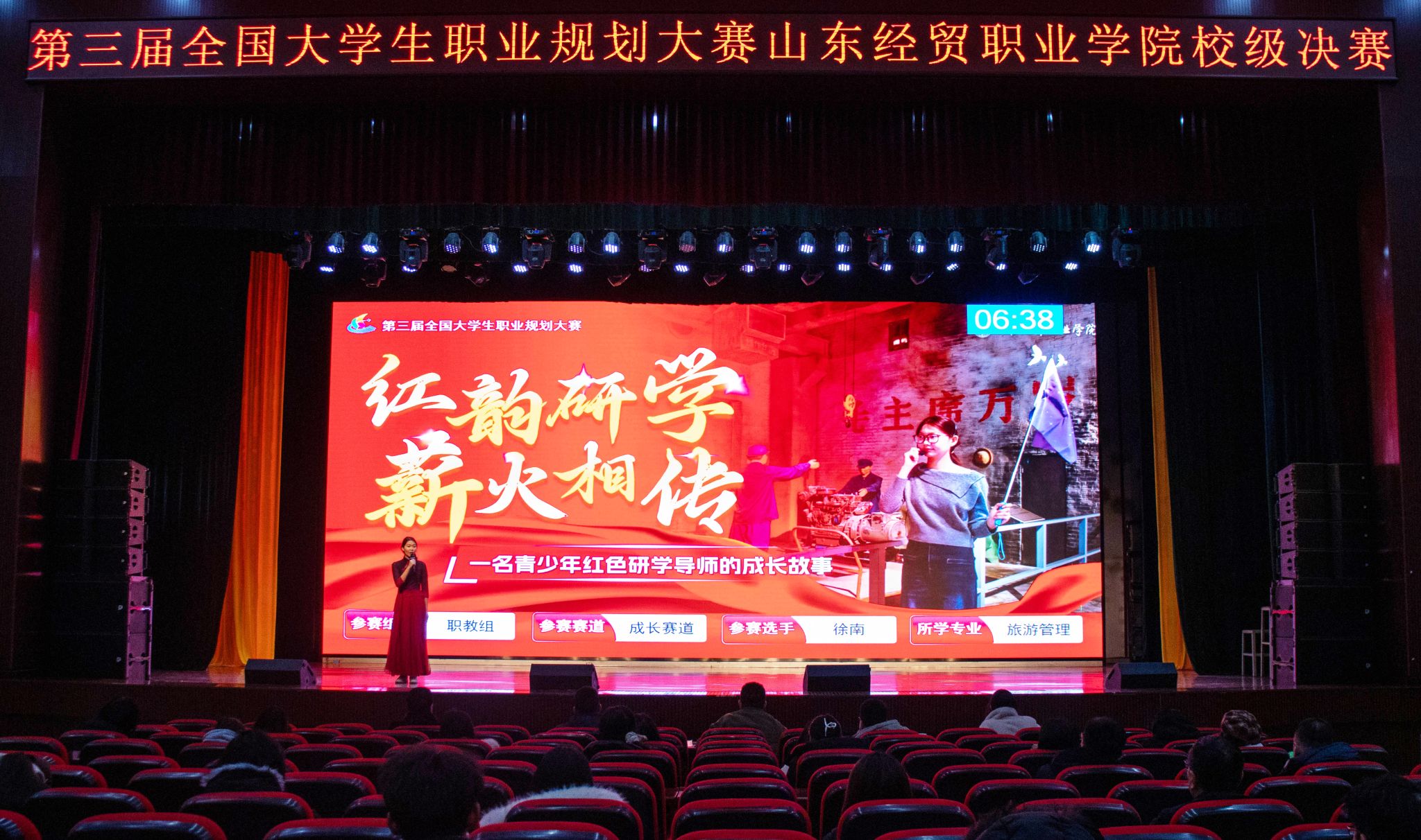决赛现场,选手们立足专业领域,展现出扎实的专业素养和清晰的职业规划。国际商务系徐南以“红色研学 薪火相传”为主题,结合实践经历与市场调研,阐述了成为青少年红色研学导师的成长路径,彰显新时代大学生传承红色文化的责任担当;工商管理系王海垚围绕“跨境电商运营师”职业目标,系统规划了从在校学生到专业人才的发展路径,方案逻辑严密、措施具体,获评审专家一致认可。